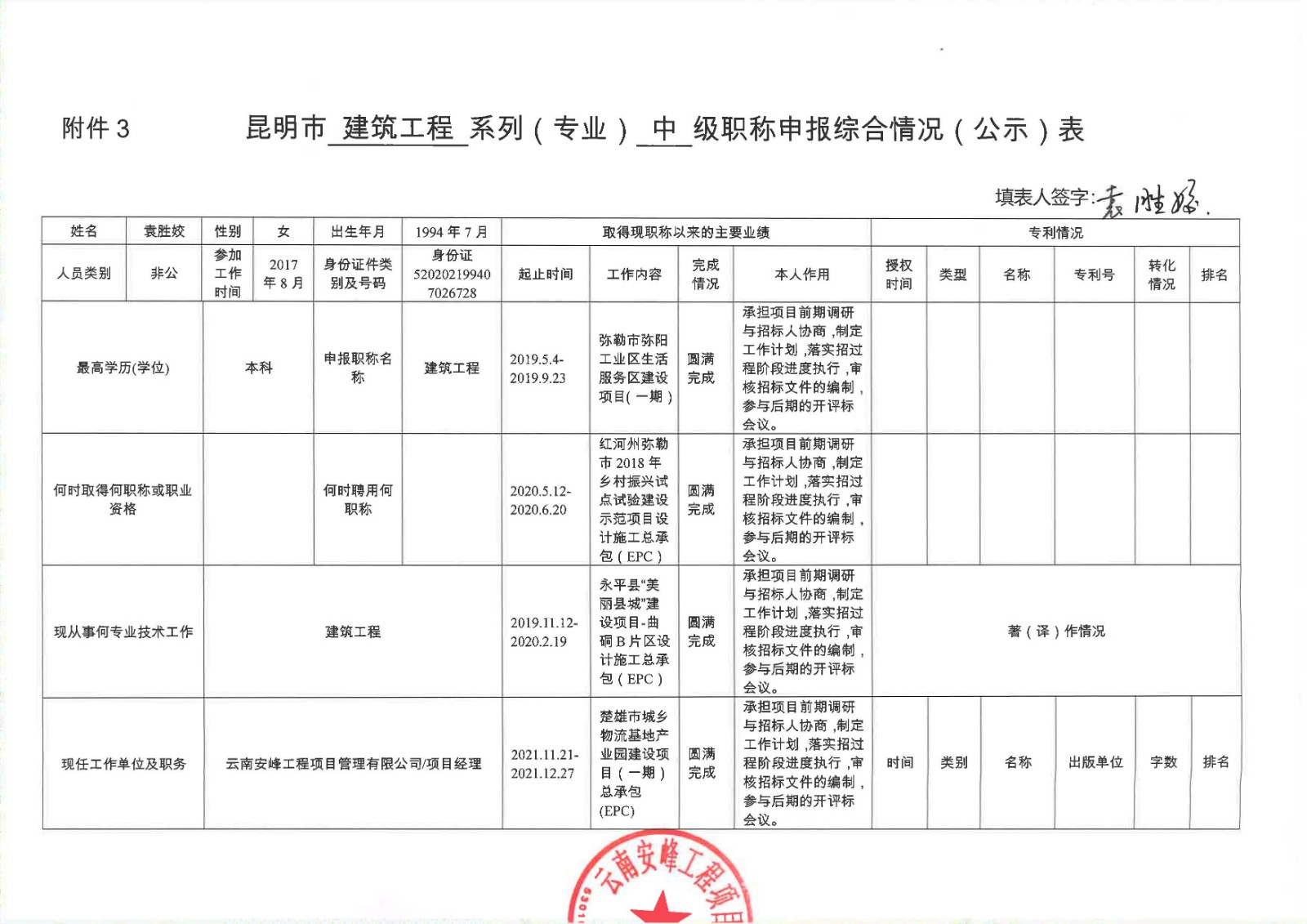 關于云南安峰工程項目管理有限公司員工袁勝姣申報建筑工程系列(專業(yè))中級職稱情況公示