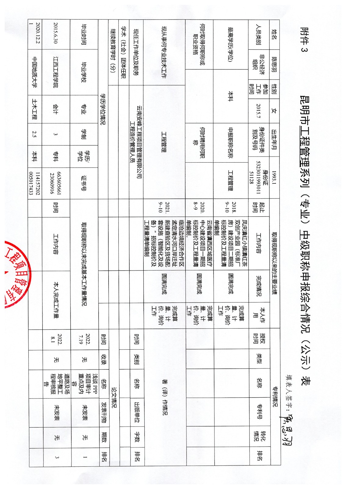 關(guān)于云南安峰工程項(xiàng)目管理有限公司員工陳思羽申報(bào)工程管理系列(專業(yè))中級(jí)職稱情況公示