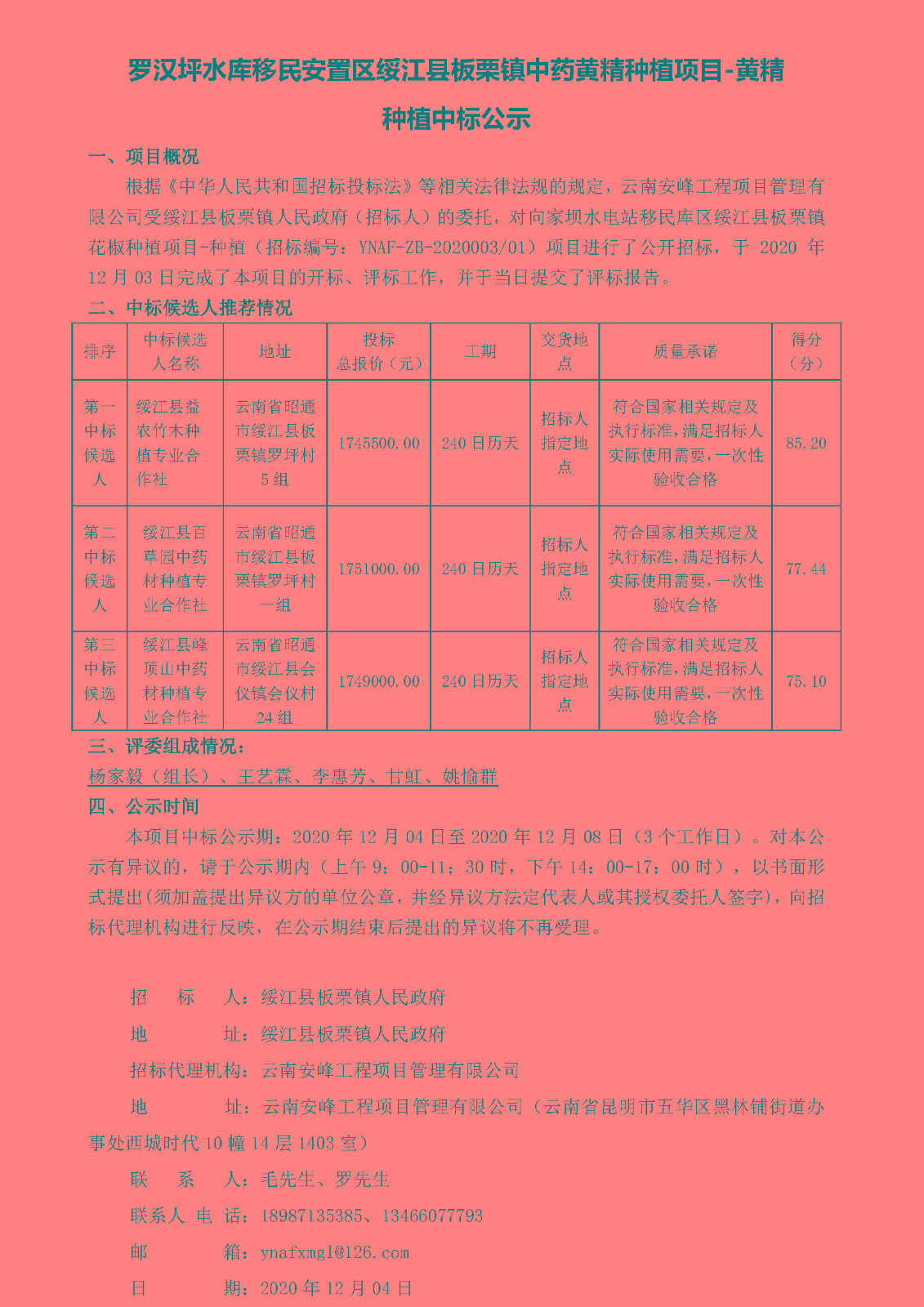 羅漢坪水庫移民安置區(qū)綏江縣板栗鎮(zhèn)中藥黃精種植項目-配套基礎設施建設中標公示