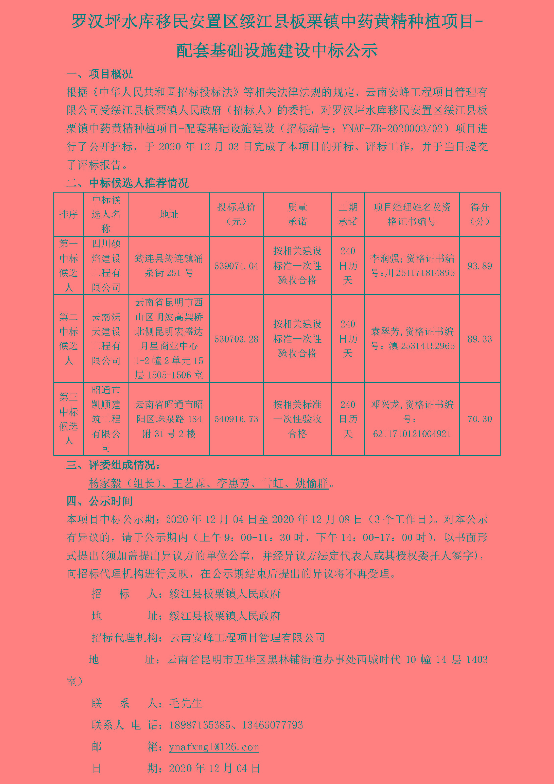 羅漢坪水庫移民安置區(qū)綏江縣板栗鎮(zhèn)中藥黃精種植項目-配套基礎(chǔ)設(shè)施建設(shè)中標(biāo)公示