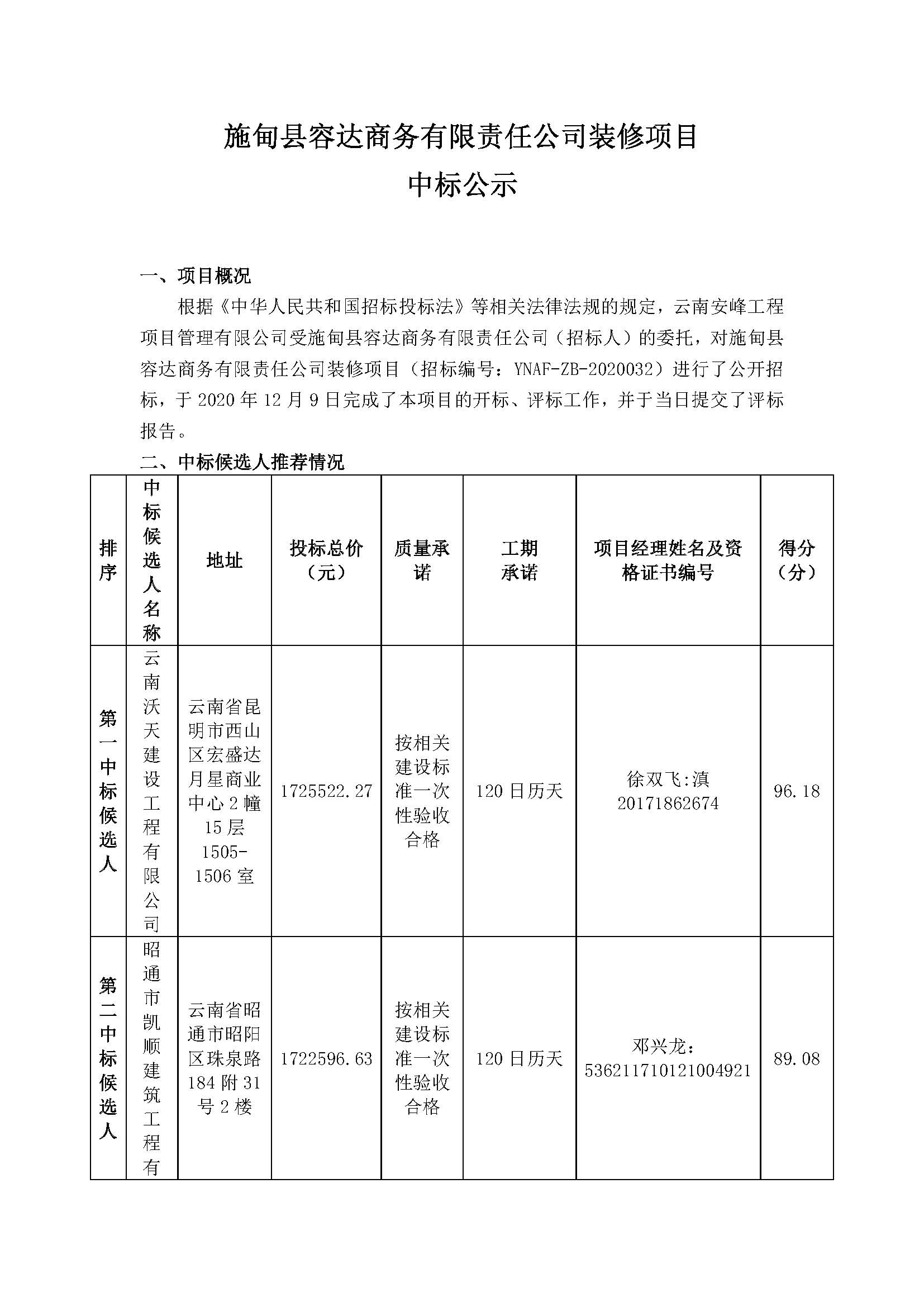 施甸縣容達(dá)商務(wù)有限責(zé)任公司裝修項(xiàng)目 中標(biāo)公示