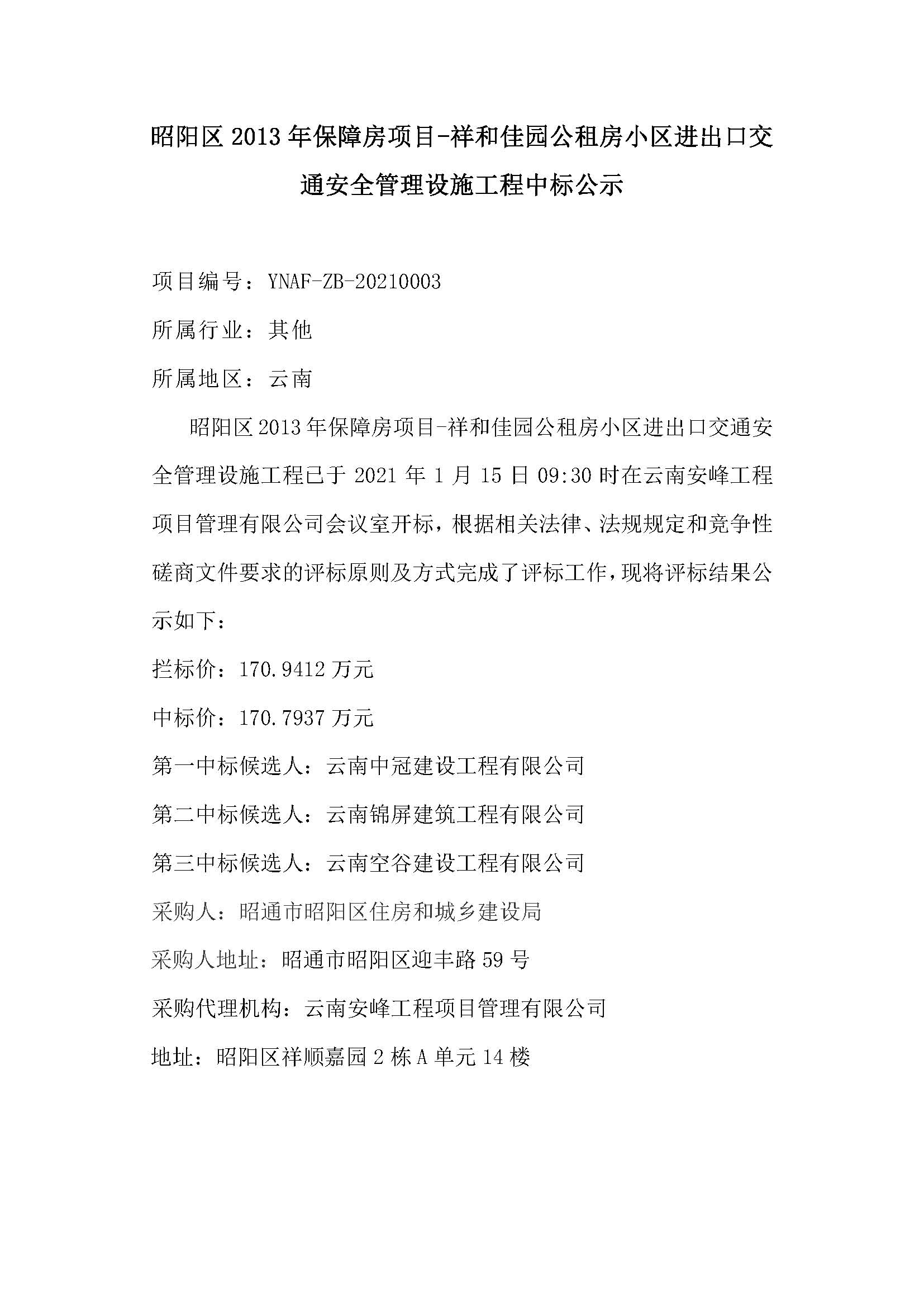 昭陽區(qū)2013年保障房項目-祥和佳園公租房小區(qū)進出口交通安全管理設(shè)施工程中標(biāo)公示