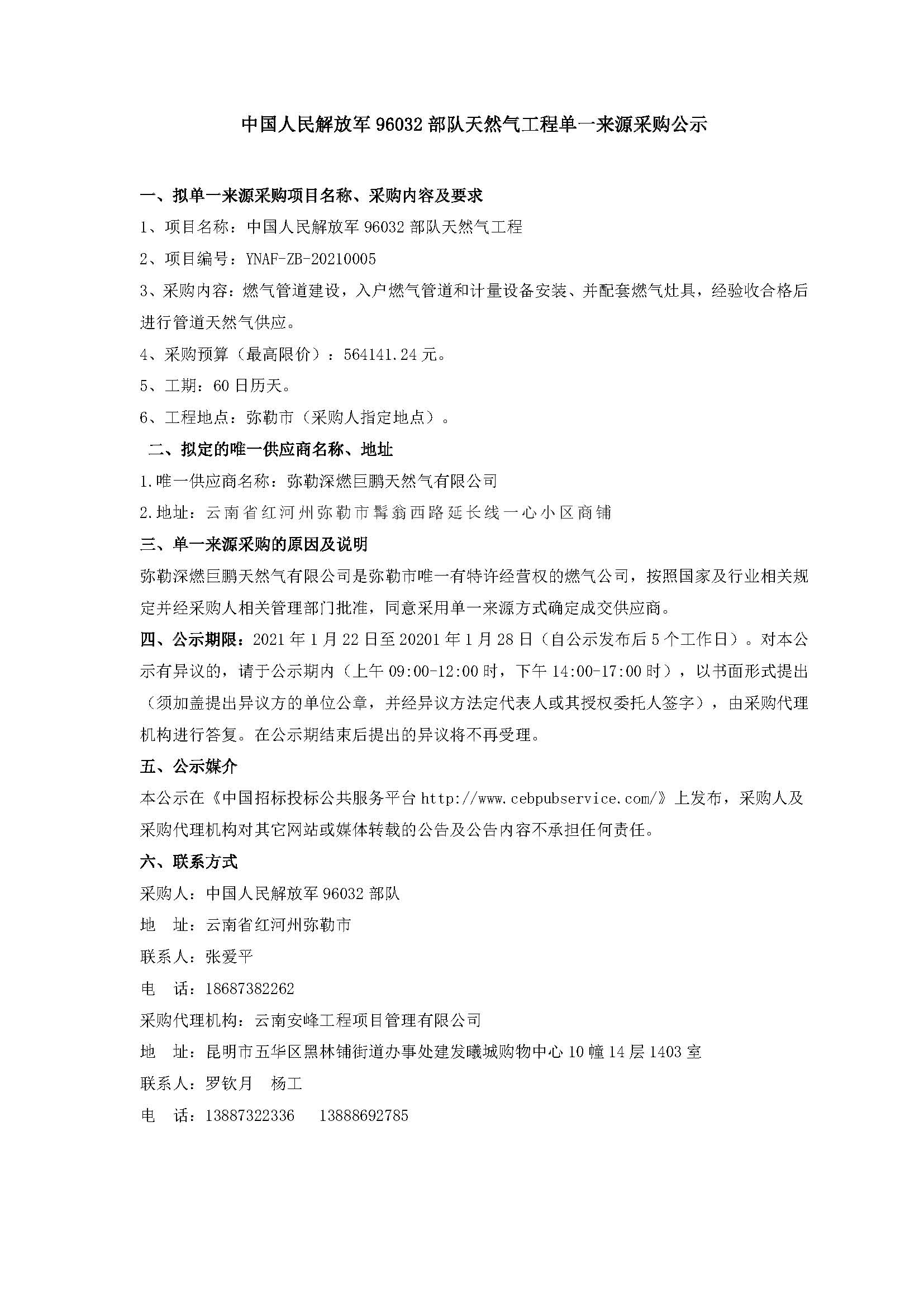 中國人民解放軍96032部隊天然氣工程單一來源采購公示