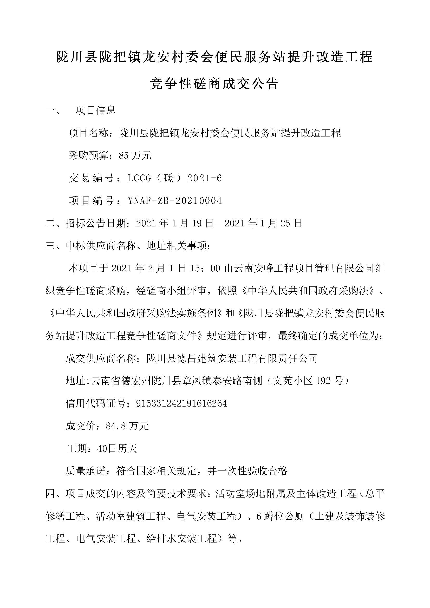 隴川縣隴把鎮(zhèn)龍安村委會(huì)便民服務(wù)站提升改造工程 競(jìng)爭(zhēng)性磋商成交公告