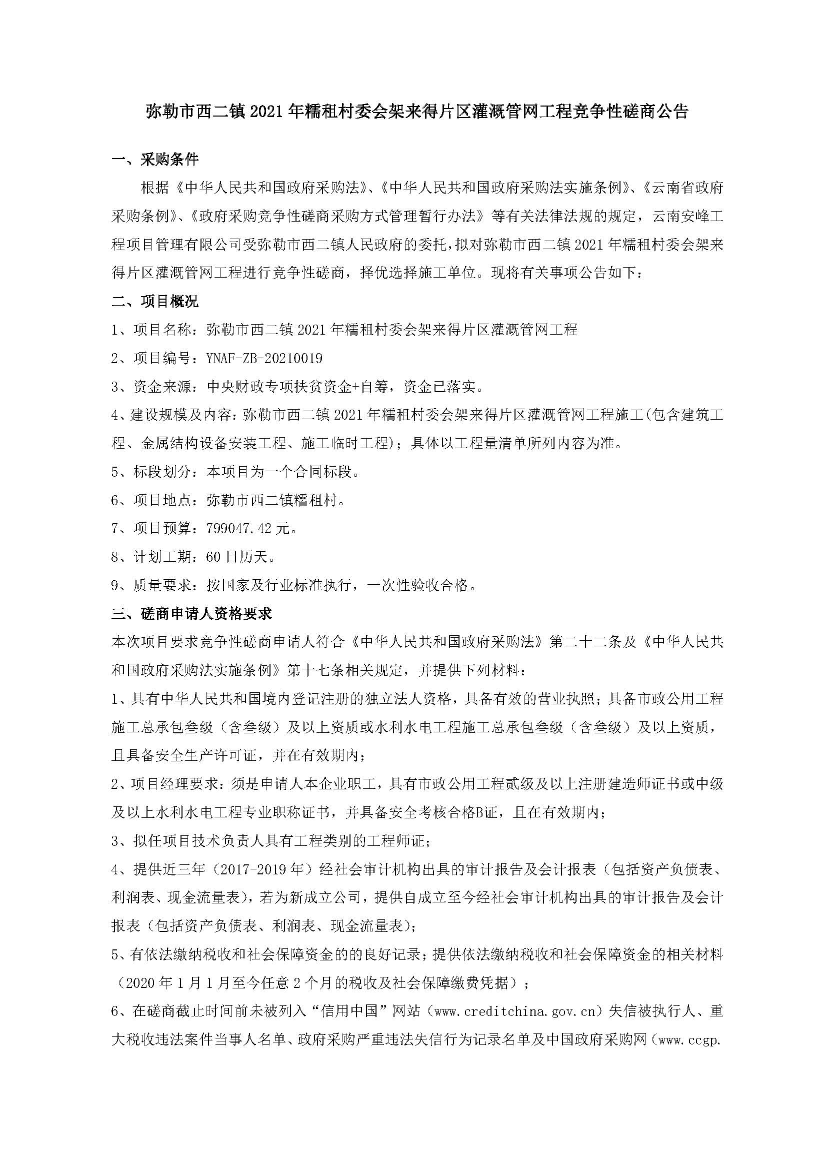 彌勒市西二鎮(zhèn)2021年糯租村委會(huì)架來得片區(qū)灌溉管網(wǎng)工程競(jìng)爭(zhēng)性磋商公告
