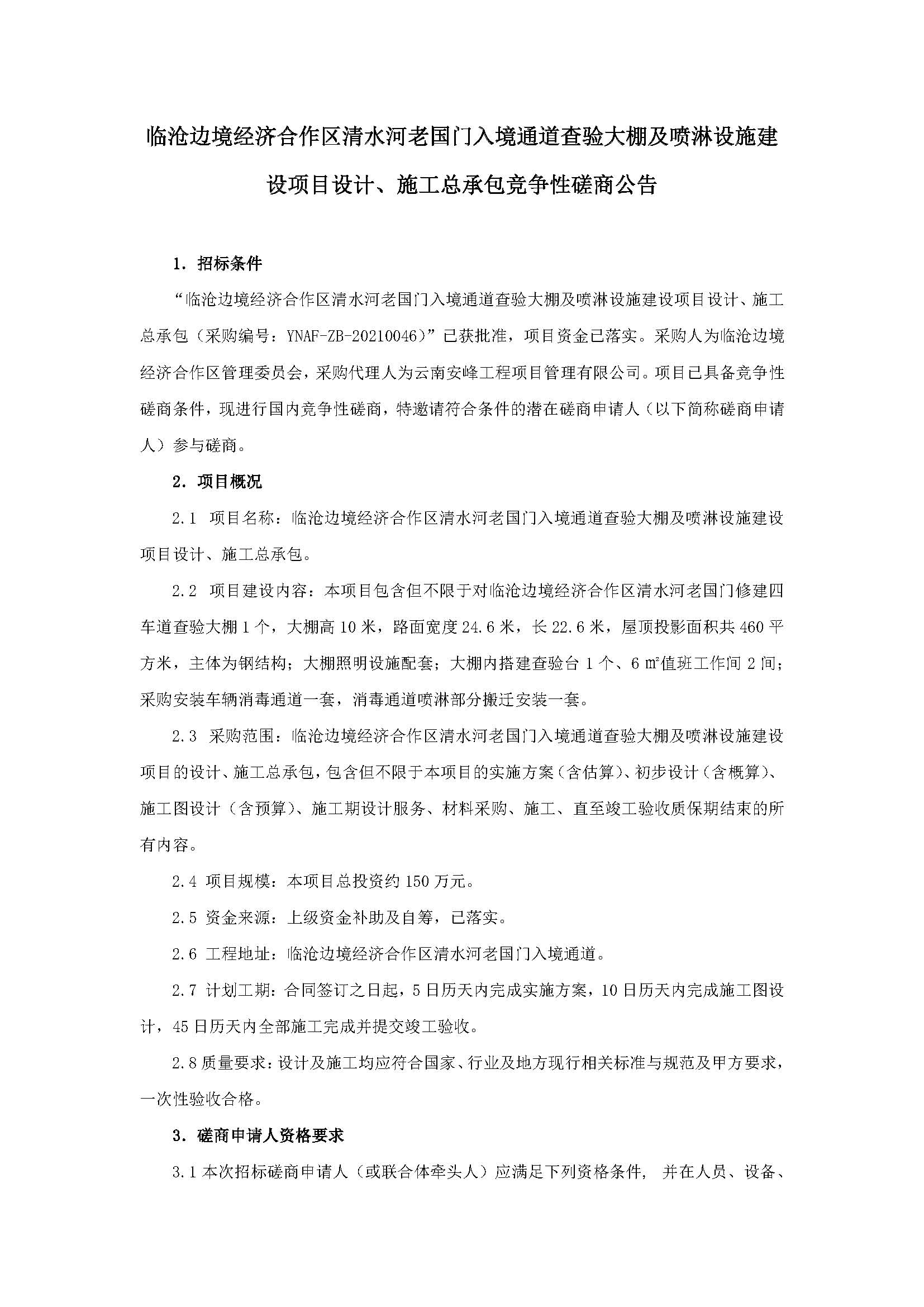 臨滄邊境經(jīng)濟合作區(qū)清水河老國門入境通道查驗大棚及噴淋設施建設項目設計、施工總承包競爭性磋商公告