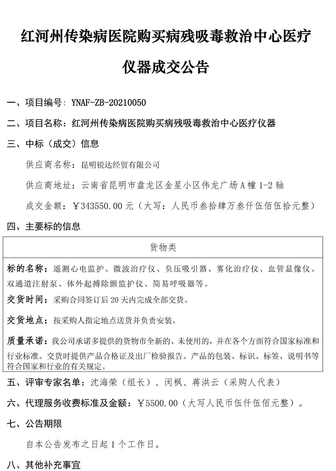 紅河州傳染病醫(yī)院購買病殘吸毒救治中心醫(yī)療儀器成交公告