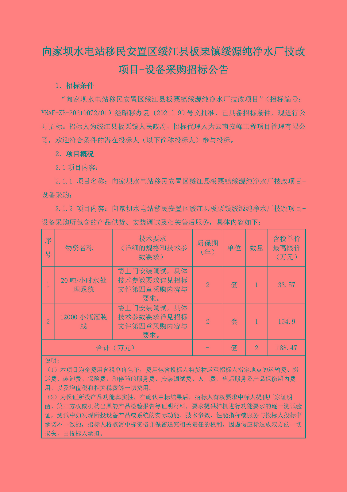 向家壩水電站移民安置區(qū)綏江縣板栗鎮(zhèn)綏源純凈水廠技改項目-設(shè)備采購招標(biāo)公告