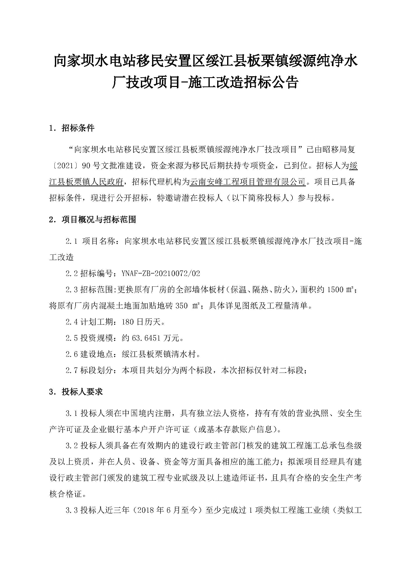 向家壩水電站移民安置區(qū)綏江縣板栗鎮(zhèn)綏源純凈水廠技改項目-施工改造招標(biāo)公告