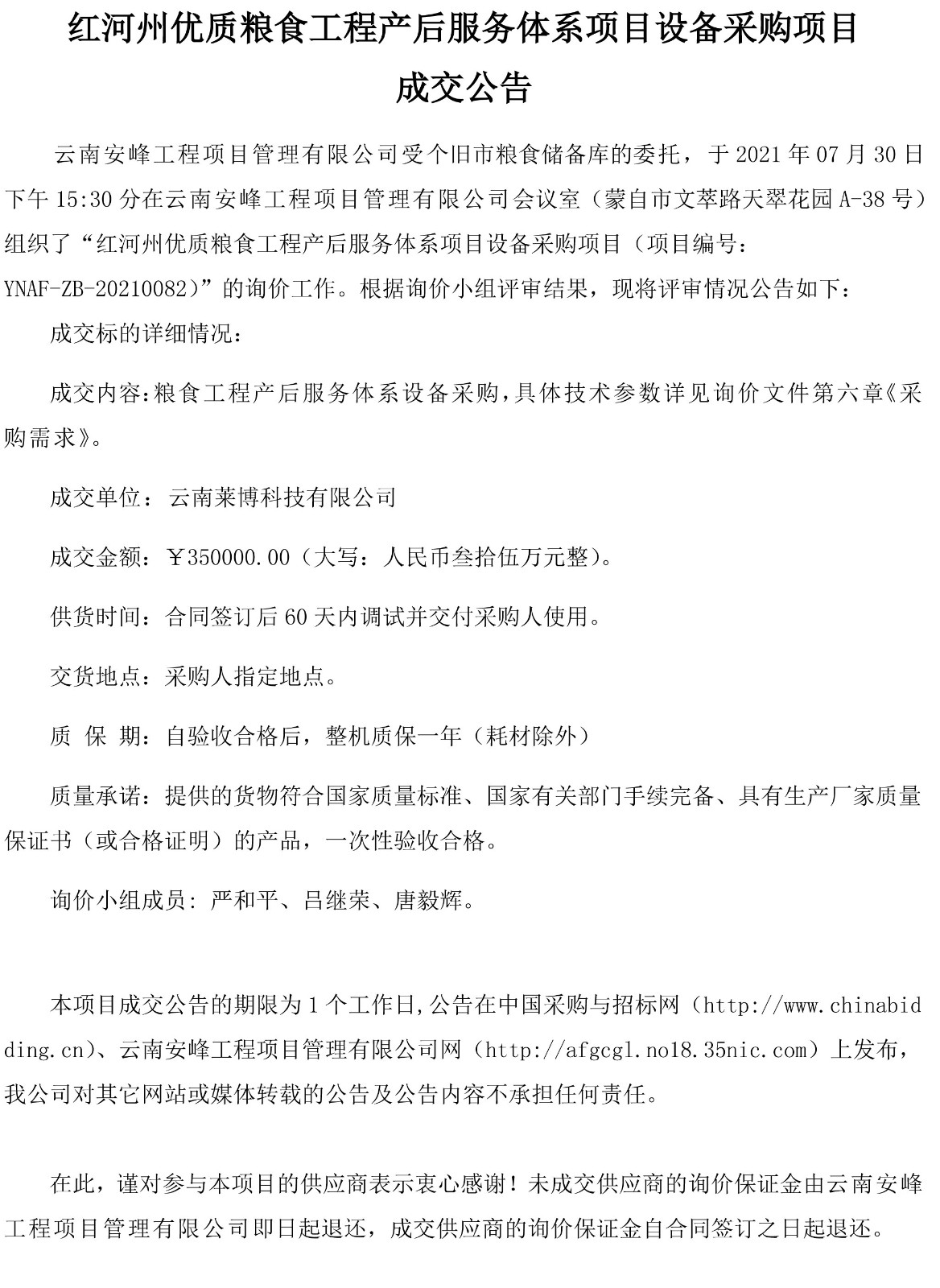 紅河州優(yōu)質(zhì)糧食工程產(chǎn)后服務(wù)體系項目設(shè)備采購項目成交公告