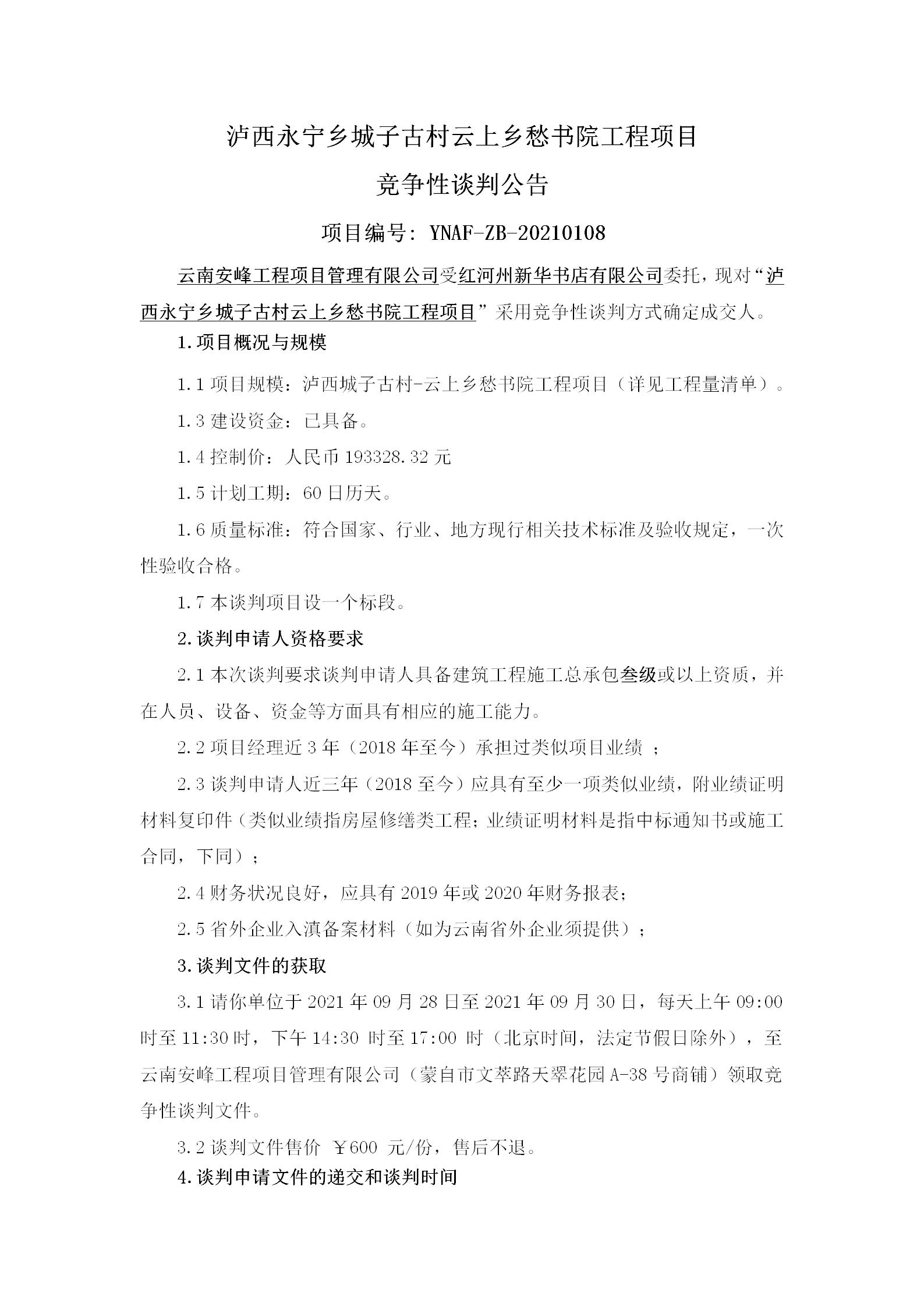 瀘西永寧鄉(xiāng)城子古村云上鄉(xiāng)愁書院工程項目競爭性談判公告