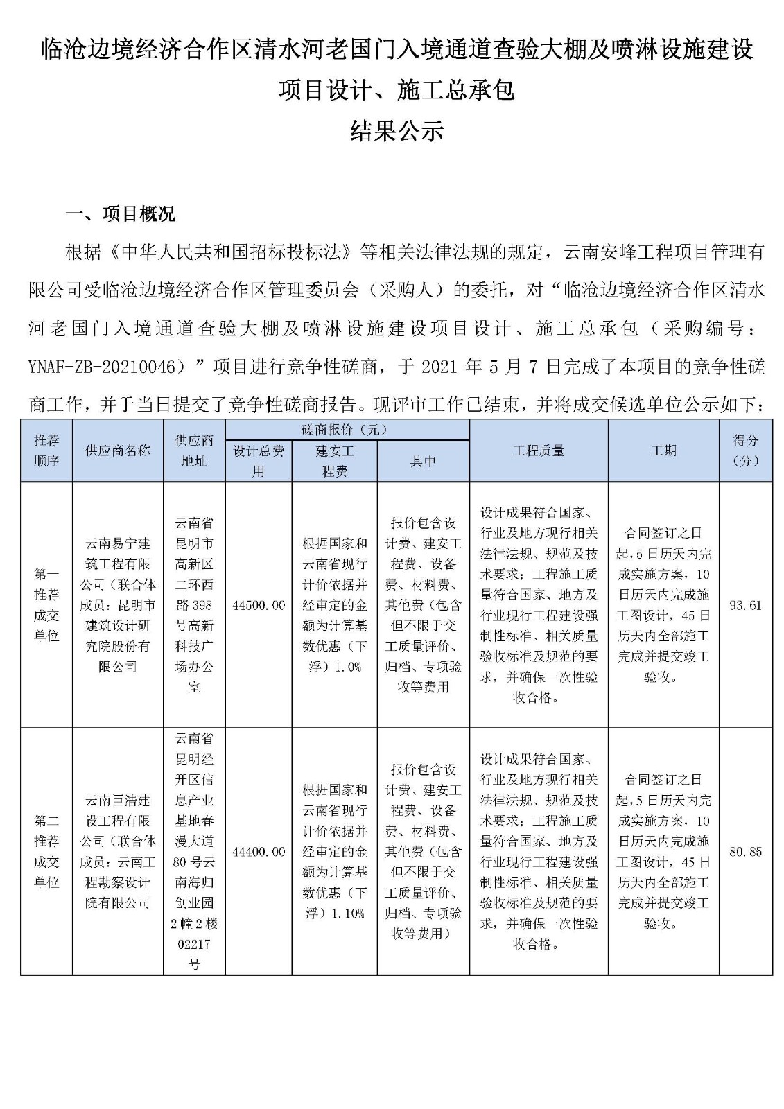 臨滄邊境經(jīng)濟合作區(qū)清水河老國門入境通道查驗大棚及噴淋設施建設項目設計、施工總承包結(jié)果公示