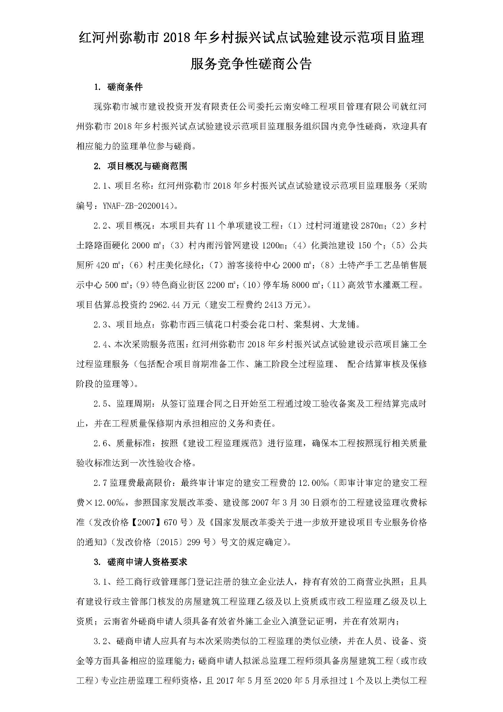 紅河州彌勒市2018年鄉(xiāng)村振興試點試驗建設示范項目監(jiān)理服務競爭性磋商公告