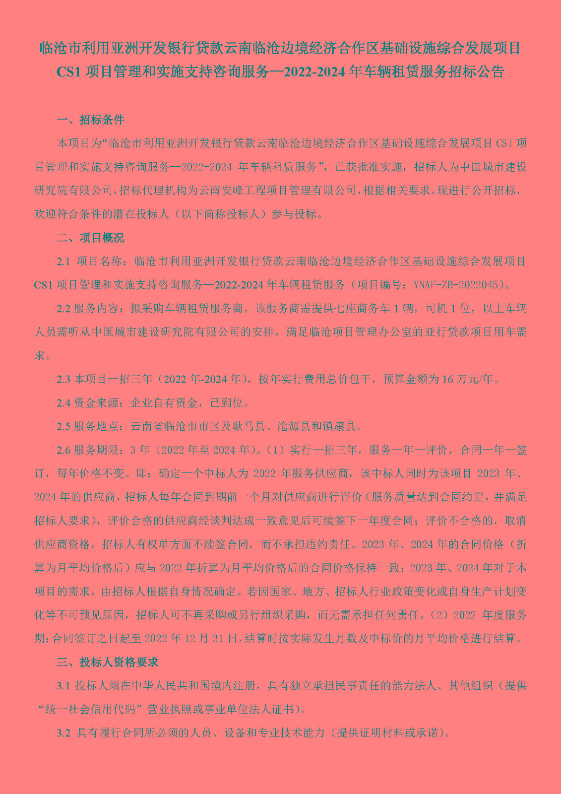 臨滄市利用亞洲開發(fā)銀行貸款云南臨滄邊境經(jīng)濟(jì)合作區(qū)基礎(chǔ)設(shè)施綜合發(fā)展項(xiàng)目CS1項(xiàng)目管理和實(shí)施支持咨詢服務(wù)—2022-2024年車輛租賃服務(wù)