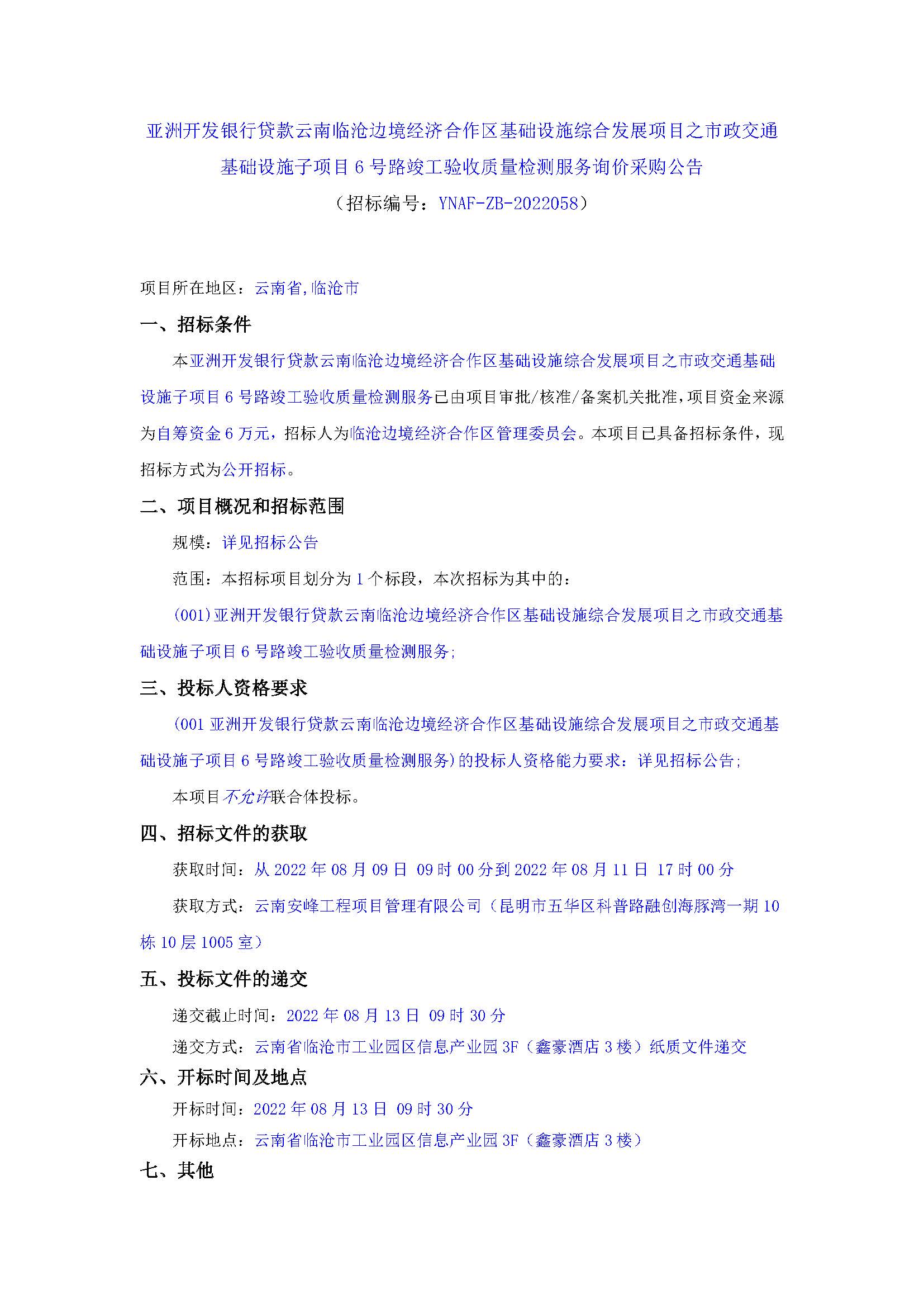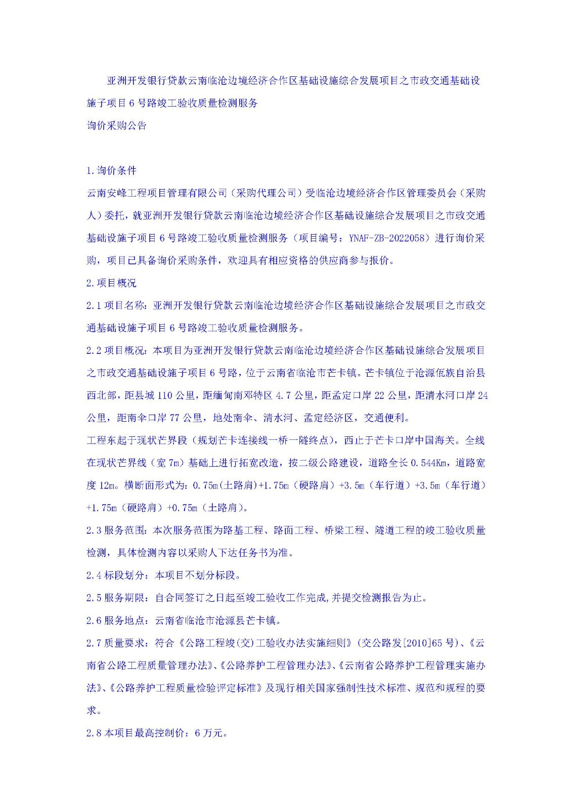 亞洲開發(fā)銀行貸款云南臨滄邊境經(jīng)濟(jì)合作區(qū)基礎(chǔ)設(shè)施綜合發(fā)展項目之市政交通基礎(chǔ)設(shè)施子項目6號路竣工驗收質(zhì)量檢測服務(wù)