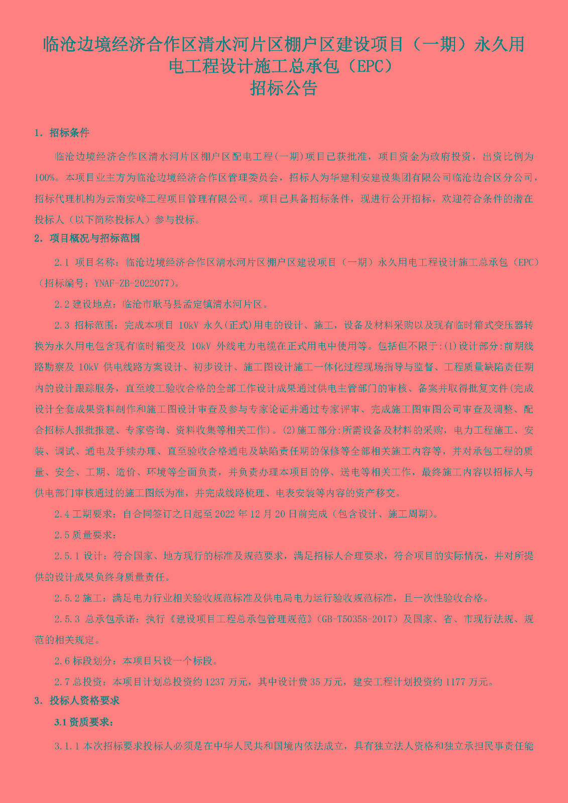 臨滄邊境經濟合作區(qū)清水河片區(qū)棚戶區(qū)建設項目(一期)永久用電工程設計施工總承包(EPC)