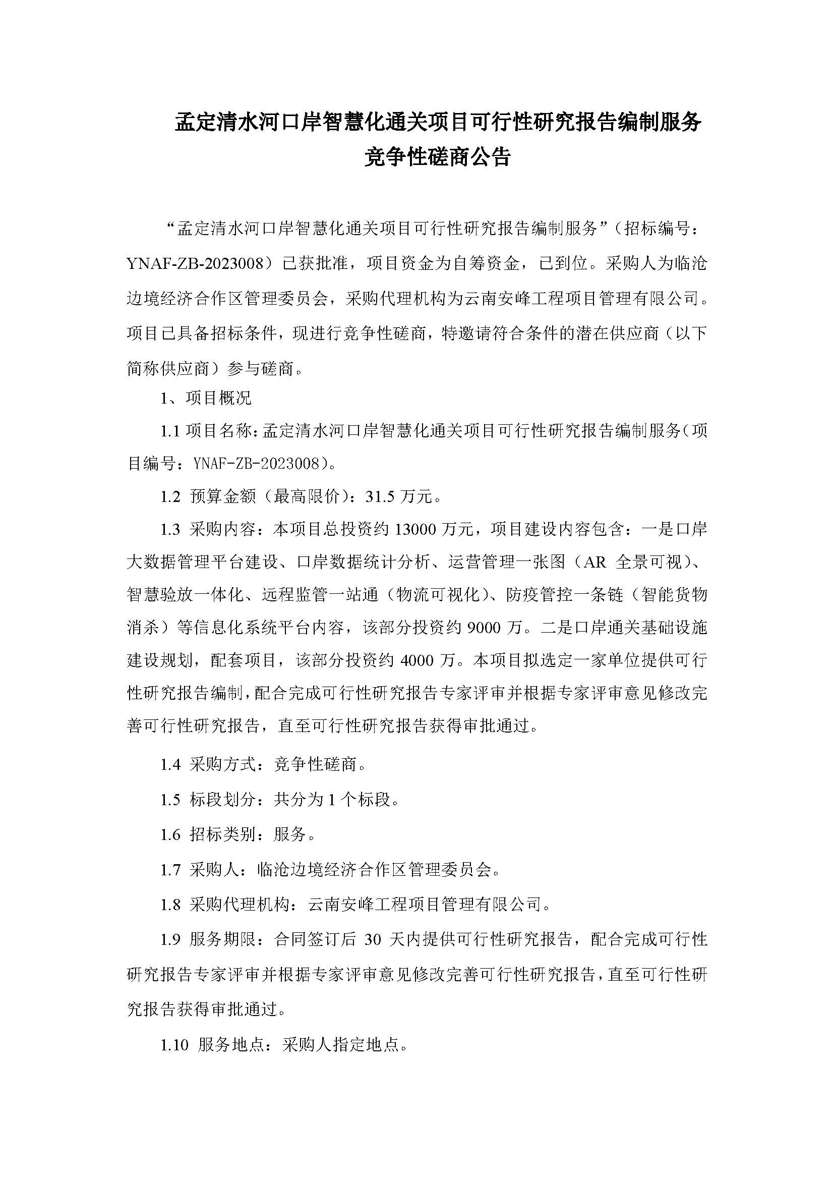 孟定清水河口岸智慧化通關(guān)項(xiàng)目可行性研究報(bào)告編制服務(wù) 競(jìng)爭(zhēng)性磋商公告