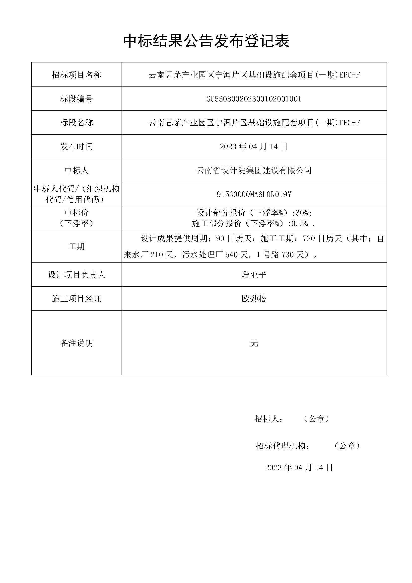 云南思茅產(chǎn)業(yè)園區(qū)寧洱片區(qū)基礎(chǔ)設(shè)施配套項(xiàng)目(一期)EPC+F中標(biāo)結(jié)果公告