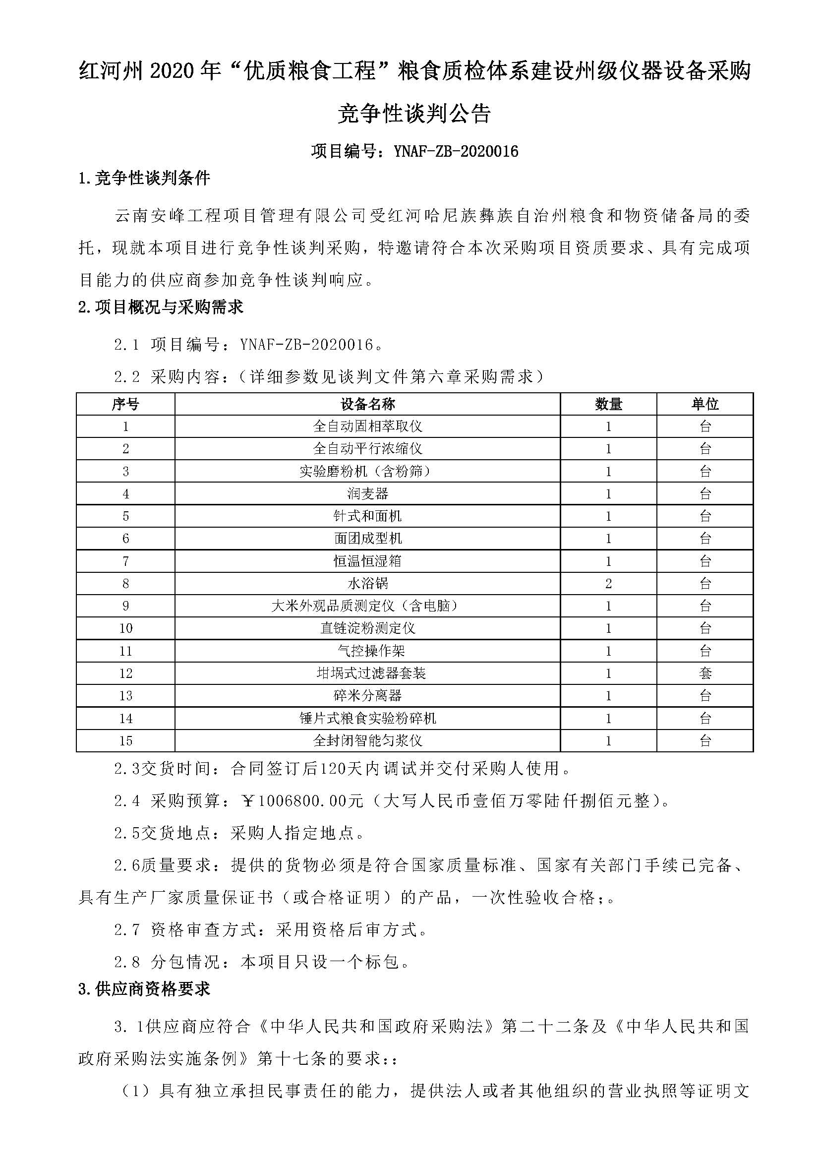 紅河州2020年“優(yōu)質(zhì)糧食工程”糧食質(zhì)檢體系建設(shè)州級(jí)儀器設(shè)備采購(gòu) 競(jìng)爭(zhēng)性談判公告