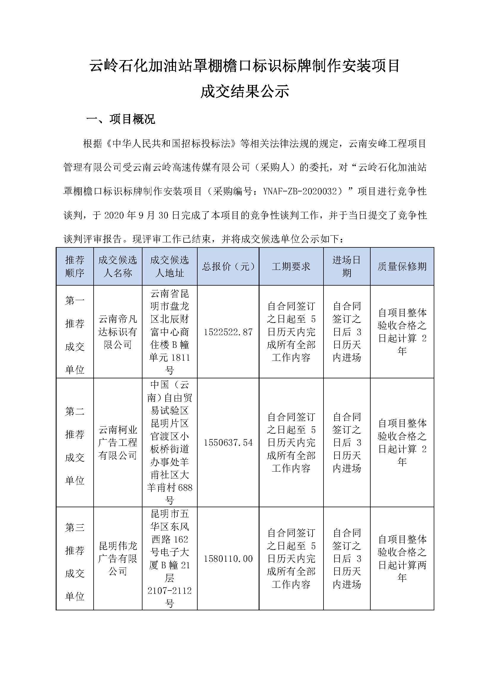 云嶺石化加油站罩棚檐口標(biāo)識標(biāo)牌制作安裝項目 成交結(jié)果公示