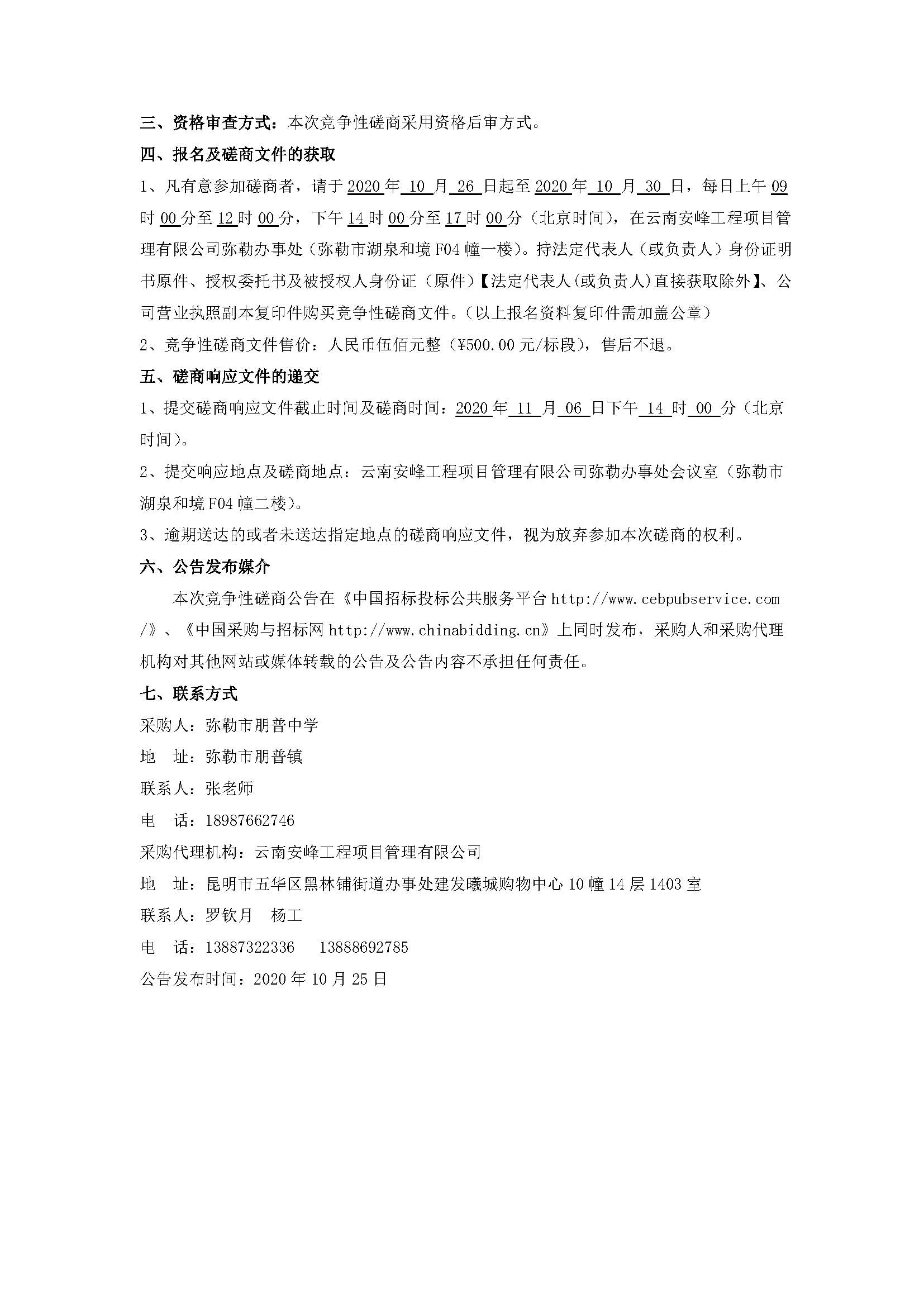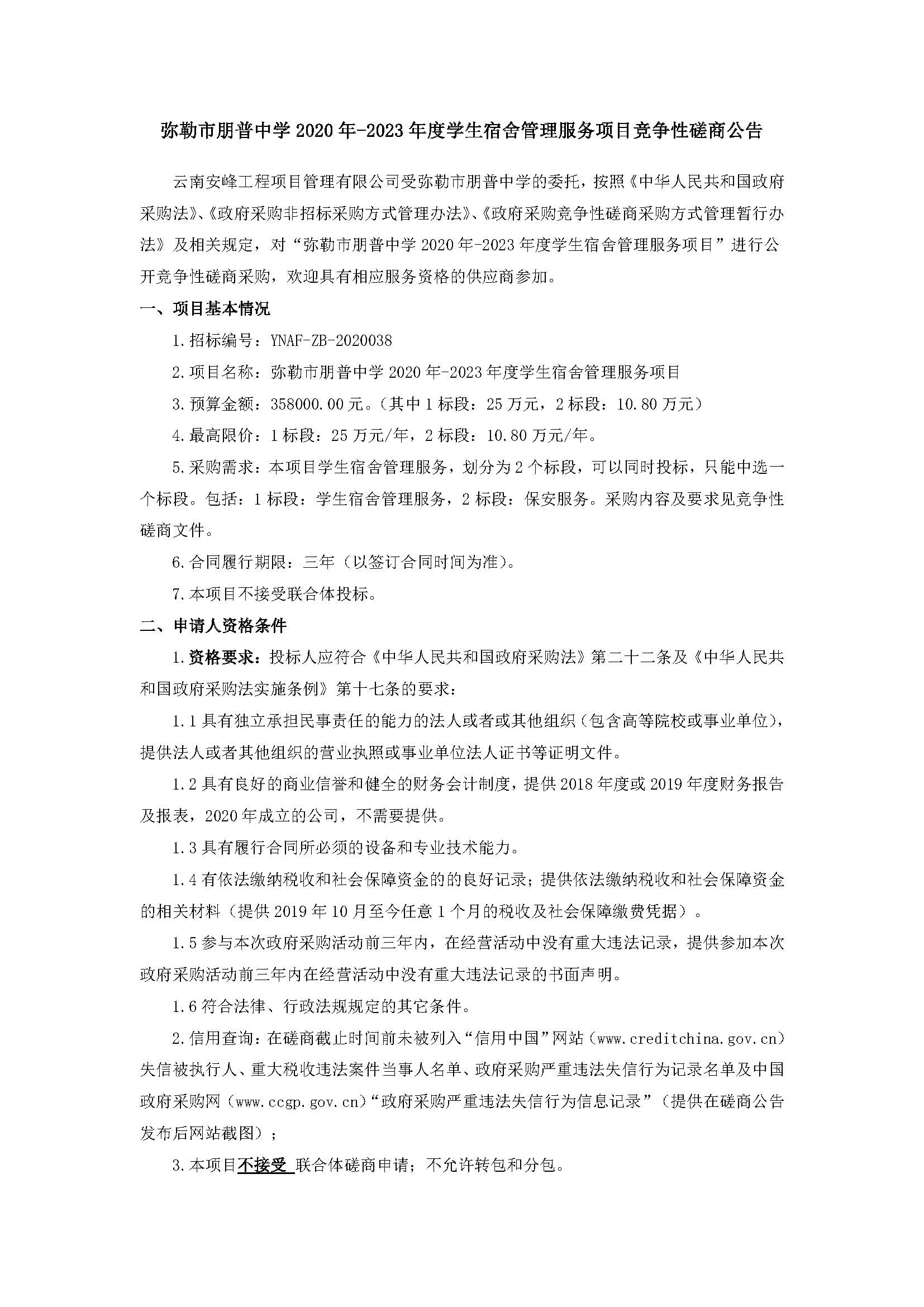 彌勒市朋普中學(xué)2020年-2023年度學(xué)生宿舍管理服務(wù)項目競爭性磋商公告