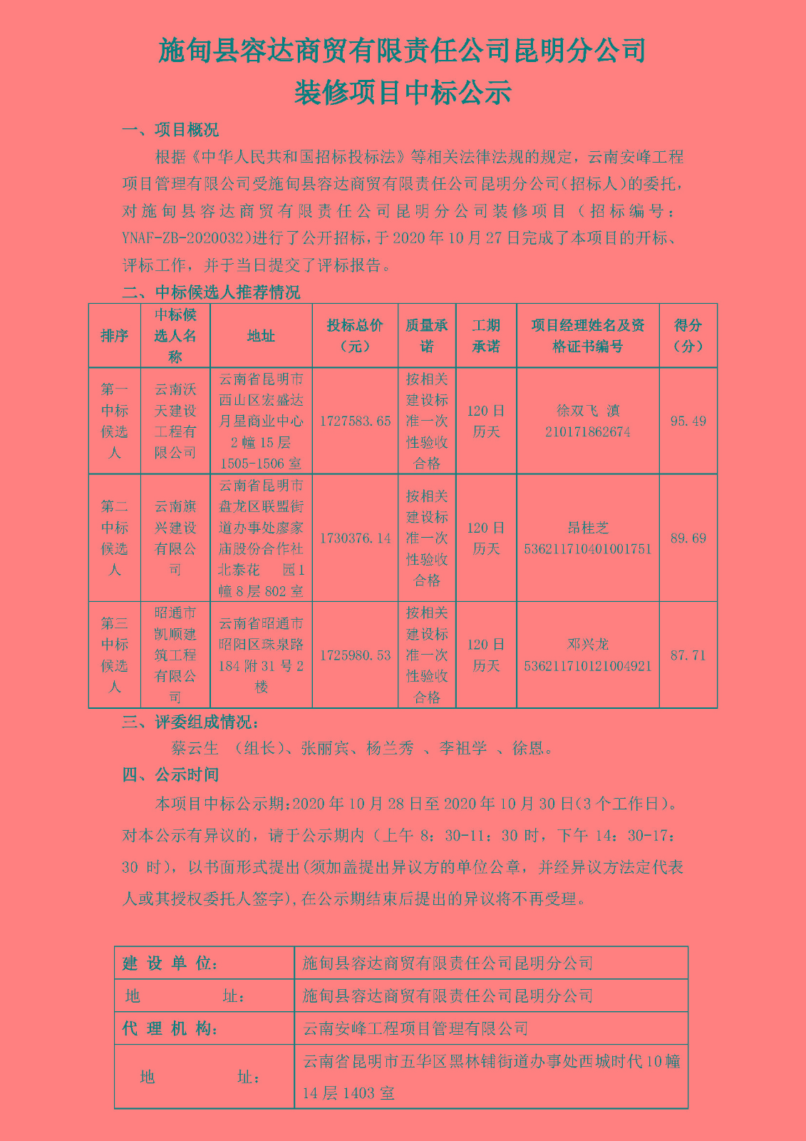 施甸縣容達(dá)商貿(mào)有限責(zé)任公司昆明分公司 裝修項(xiàng)目中標(biāo)公示
